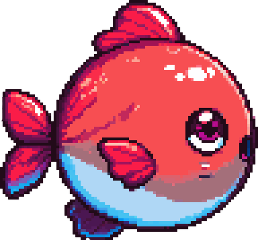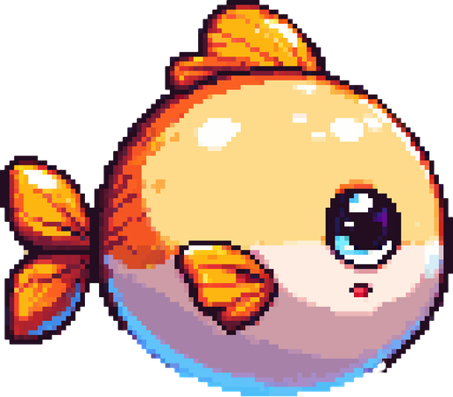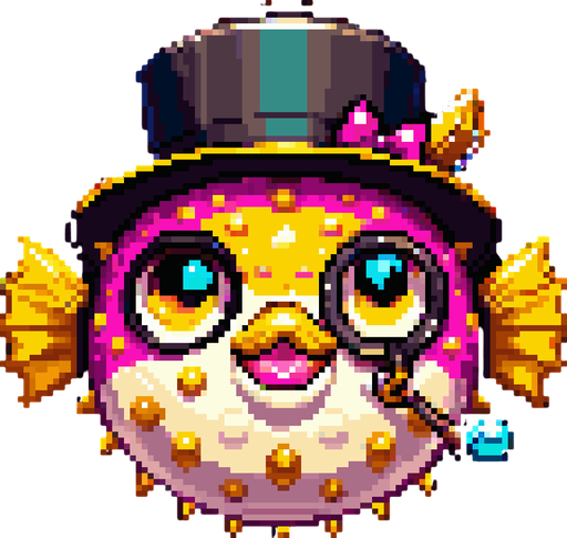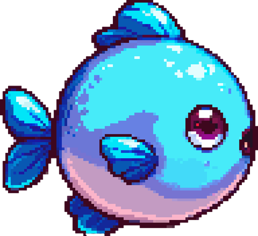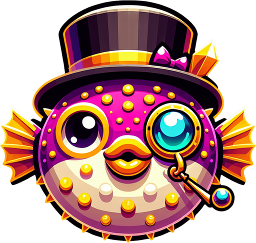 a game logo for a game called 'Bubble Blower Tycoon' about a happy purple pufferfish with yellow fins and spines that builds an underwater empire of bubbles. Cartoon. Single Game Texture. In-Game asset. 2d. Blank background. High contrast. No shadows
