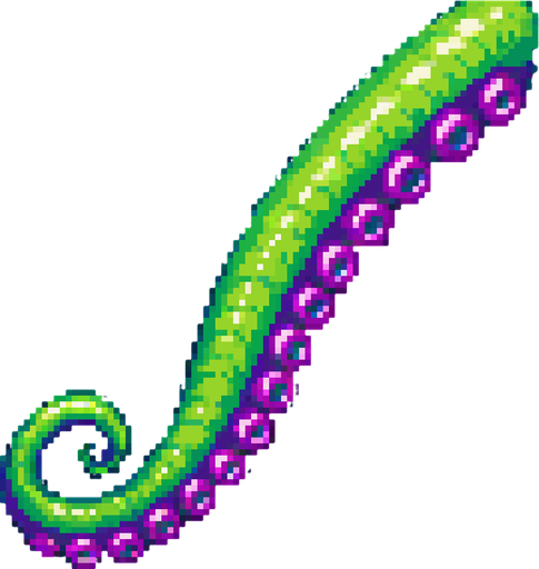 A outstretched straight octopus tentacle. Green with purple suckers. Cartoon.. Single Game Texture. In-Game asset. 2d. Blank background. High contrast. No shadows