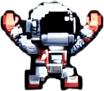 Pixelart. An icon of a an arm holding javelin with fire around it.. Single Game Texture. In-Game asset. 2d. Blank background. High contrast. No shadows.