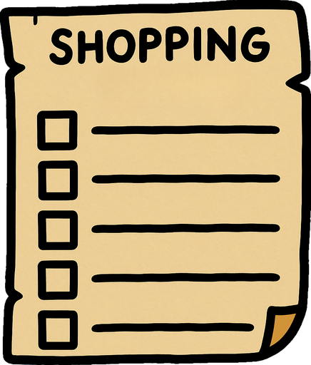 Shopping list that says Big ass coat, Broken keyboard, skeet blanket, pink leopard mink, built-in onesie with the socks. In-Game asset. 2d. High contrast. No shadows