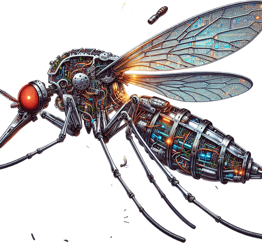 The robotic mosquito is a marvel of miniature engineering, its metallic body gleaming in the light. Its two transparent wings, adorned with intricate circuitry patterns, buzz rhythmically as it hovers and darts through the air. Six delicate legs, tipped with sharp points, enable it to perch on surfaces with remarkable precision. A pair of long, segmented antennae, their tips glowing faintly, twitch and sense the environment. Two glowing eyes, either red or blue, emit an eerie light as they scan the surroundings. However, this mechanical menace can also be crushed, its once pristine form reduced to a mangled mess of dented metal, broken wings, and exposed wires. Sparks might fly from its damaged innards, and its once bright eyes may flicker and fade. This sprite sheet captures both the living and destroyed states of the robotic mosquito, showcasing its intricate details and the grim aftermath of its demise.. Single Game Texture. In-Game asset. 2d. Blank background. High contrast. No shadows.