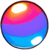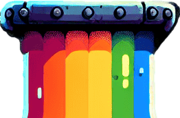 Vue de face centrée d'une machine magique en forme de pièce montée arc-en-ciel avec une petite entrée d'alimentation en bas au milieu, un très grand hublot central et un tube transparent dirigé vers le haut.. Single Game Texture. In-Game asset. 2d. Blank background. High contrast. No shadows
