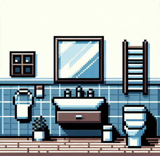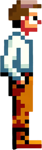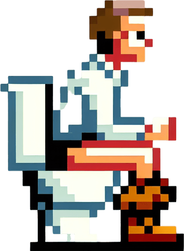 8-bit pixelated image of a video game character sitting with hands on a large belly, wearing a white shirt and brown pants. The setting is a simple bathroom, with the character as the main focus. Single Game Texture. In-Game asset. 2d. Blank background. High contrast. No shadows.