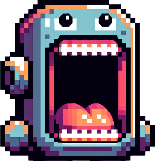 cute hungry chatbot character head. mouth wide open to eat information. pixelated. 8 bit..