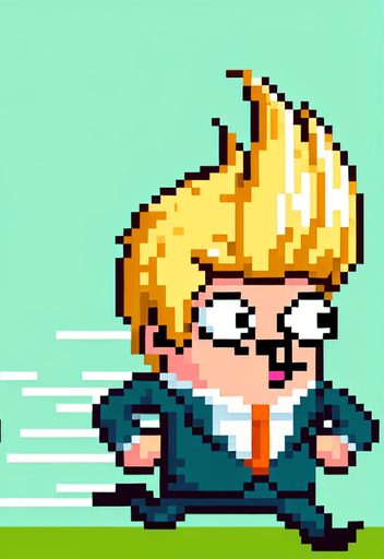 a 2d funny character in 8-bit and cartoon of donald trump. generate 2 images, one standing still and one running..