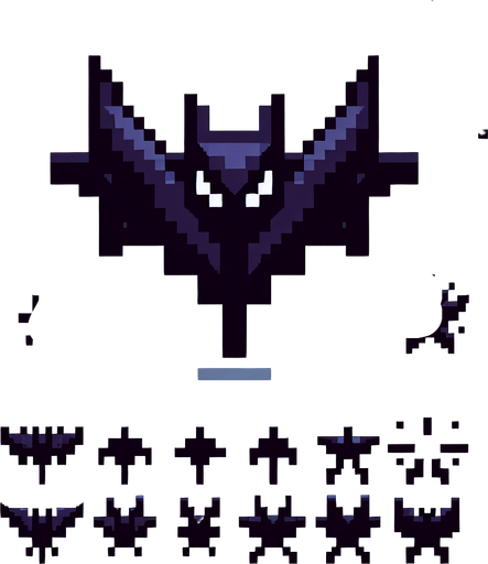 8-bit pixelated dark bat stylized icon shaped throwing ninja star on a spritesheet containing multiple stages of the bat flapping it's wings up and down.