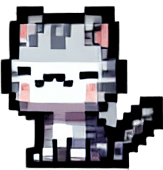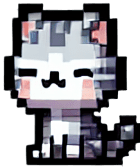 A spritesheet of a character sprite, which is a little grey and white striped cat, in various poses of sitting, looking happy, looking sad. Pixelart. The sprites should be laid out on a rectangular grid with clear space between them.Top down perspective..