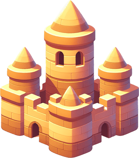 face view of a simple sandcastle with 2 flat towers on the sides and a central one a bit higher but flat too.. casual game style