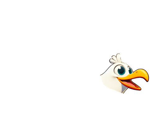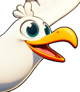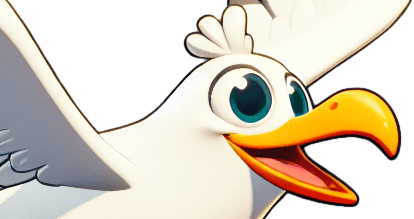 Create a cartoon-style illustration of a flying seagull. The goal is to capture a lively and playful character. Front perspective.