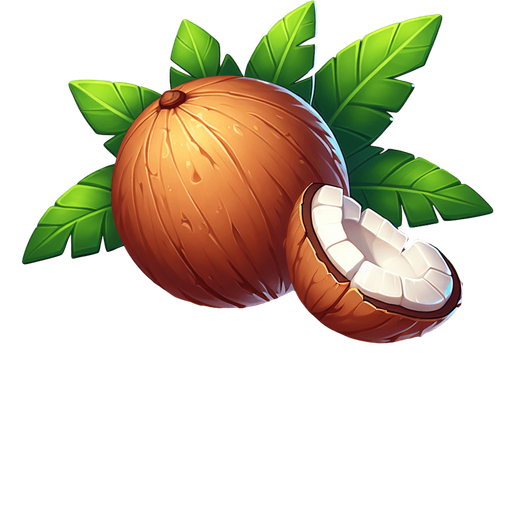 A coconut and a few pieces of coconut. Single Game Texture. In-Game asset. 2d. Blank background. High contrast. No shadows.