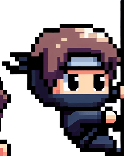 8-bit pixelated chibi ninja character sprite sheet with two simple, exaggerated action poses: one in mid-jump, with a small, round body and oversized head, arms and legs slightly bent in a cute, chibi-like leap. The second pose should emphasize the chibi ninja sliding down a wall: his body is pressed close to the wall with one hand extended upward, gripping or bracing against the wall. His feet should be pressed against the wall as he slides down, while his face is turned in the opposite direction, giving the impression he's scanning for threats or preparing to leap. The design should maintain the playful chibi proportions, with a dark, minimalistic outfit and a simple headband, all within a retro 8-bit pixel aesthetic and a limited color palette..