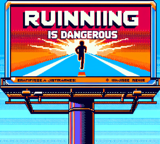 face view of billboard warning about "RUNNING IS DANGEROUS". video game style