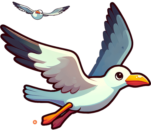 A cartoon seagull. Flying, side profile.. Single Game Texture. In-Game asset. 2d. Blank background. High contrast. No shadows