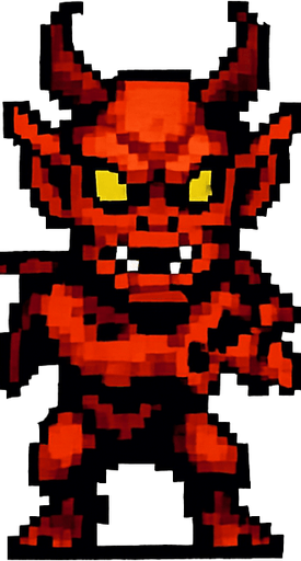 A sprite sheet for a demonic imp.Two walking sprites alternating feet and one attack sprite. Straight forward frontal view. Imp is facing the camera. White background. Retro pixel art..