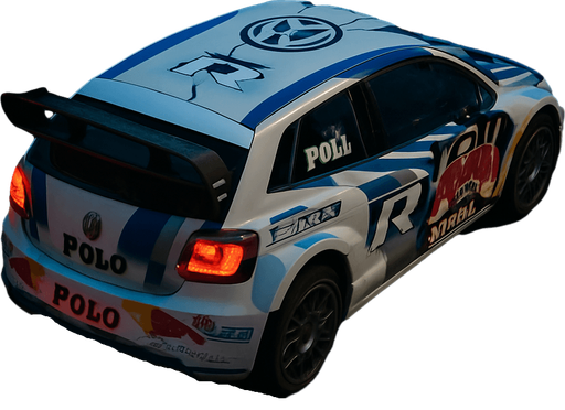 Photorealistic Volkswagen Polo R WRC Rallycar in nightlight, drone topview from back and 45 degrees angle in top right corner