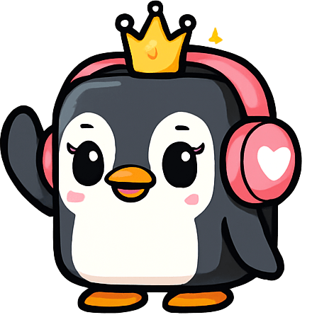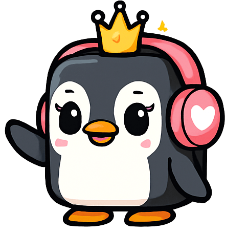Create a 2D character sprite sheet, arranged in a 2x2 grid. The subject is an adorable, girly, cubical Penguin Princess. She wears a small, cute sparkling crown. Her oversized pink headphones have a small white heart decal on each ear cup. She has large, expressive eyes and a sweet smile. The style is clean vector art with simple cel shading, on a plain white background. The 4-frame animation is a side-to-side wave.