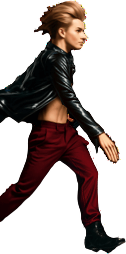 Black leather combat boots, wine red joggers, Swishy graceful man Cyberpunk manga, arm extended, side profile view walking animation, shiny black leather biker jacket longsleeves shirtless Skinny abs blonde pompadour guy, action shot wine red joggers combat boots, Background removed, "Full-body character, entirely in frame, no cropping of face, head, or feet" "Complete character visible, from head to toe, fully centered in the image" "Entire character, including face and boots, fully within the frame" Character fully contained within a square frame, no edges cut off fashion model walking pose Style of vogue magazine